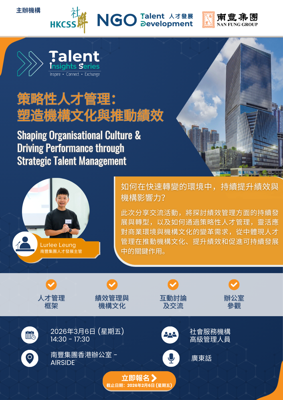 Join us for an insightful sharing and exchange session at Nan Fung Group, led by Lurlee Leung, Head of Talent Development. He will share his experiences in leading transformation journey in performance management, including how adaptive practices were adopted to respond to shifting business environments and cultural needs. Through interactive discussions, participants will gain a systematic and forward-looking perspective of talent management, uncovering effective frameworks that shape organisational culture, boost performance, and strengthen ties to organisational sustainability.